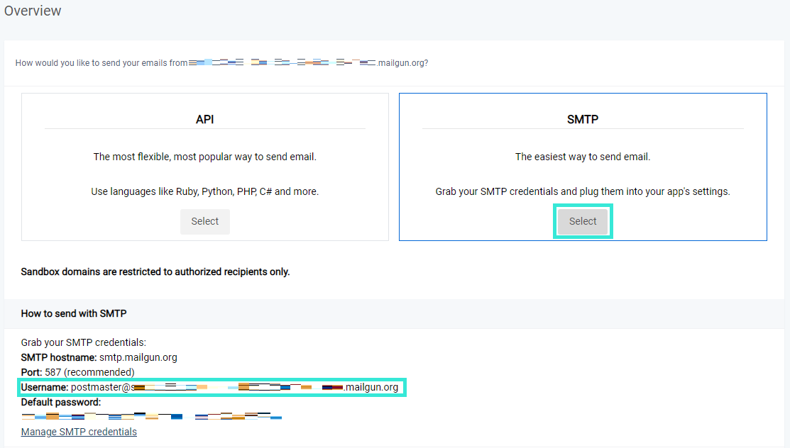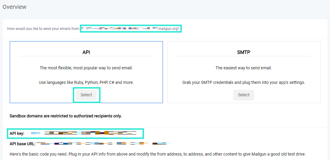 The 'Domain' can be found at the top, and the 'API key' can be found by clicking 'select' under the 'API' section: