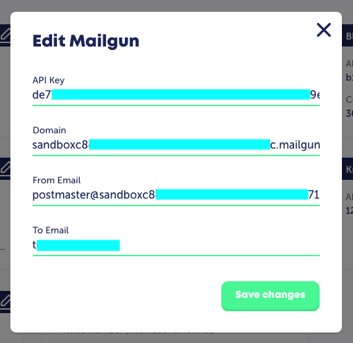The 'From email' is the 'Default SMTP Login' field from the Mailgun admin, and the 'To email' is that which you authorized above. Click Save changes.